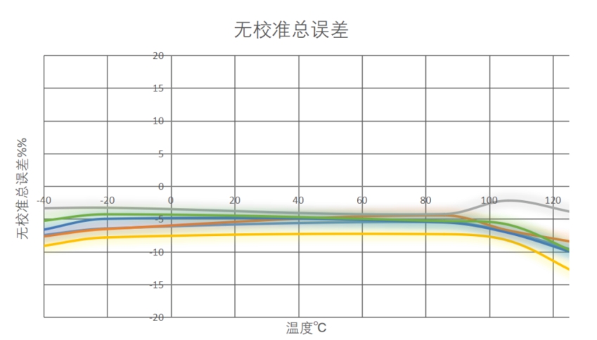 SHC64115單芯片即可實現完整的采集電路,并且提供良好無校準誤差,常溫下SHC64115的無校準總誤差(含失調誤差,增益誤差,非線性,基準誤差等)為0.07%,全溫范圍(-40~125℃)SHC64115的無校準總誤差為0.15%。
