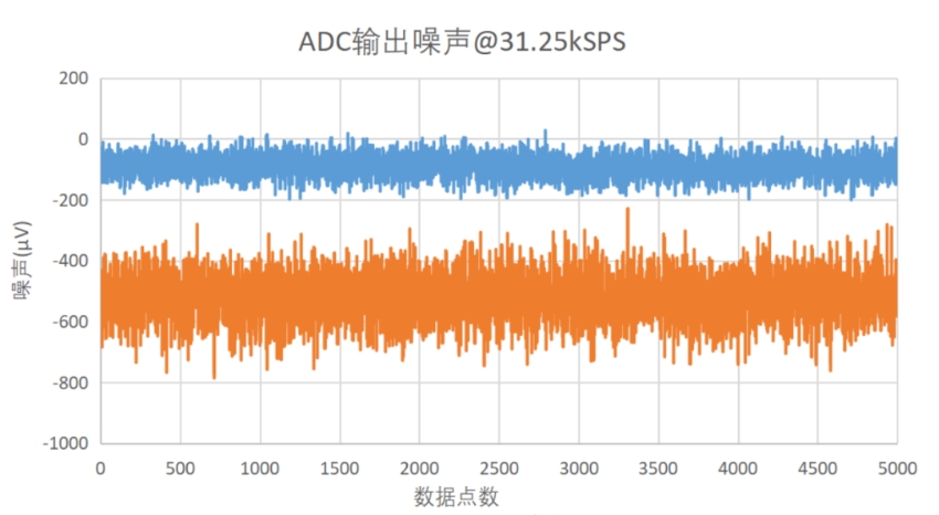 SHC64115提供良好的噪聲特性,在31.25kSPS的轉換速度下提供接近16bit的Noise free resolution,相比行業競品有近1位的提升,良好的噪聲,有利于小信號的精度,特別是在電流采集應用中,在保證同樣的0.1%精度下可使用更小阻值的采樣電阻來降低系統功耗。